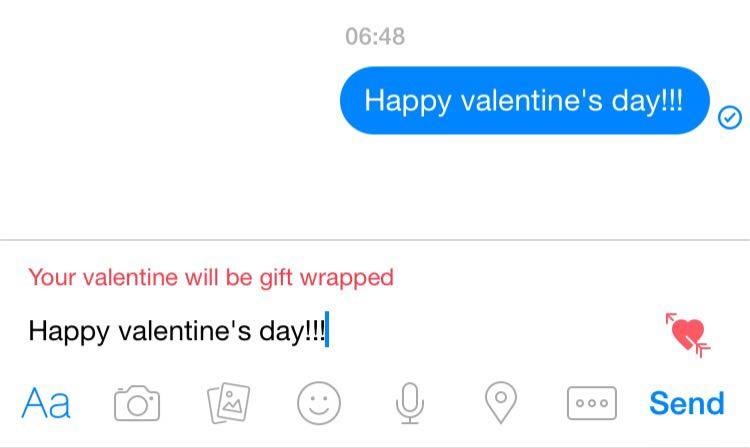 Theo đó, Facebook chèn biểu tượng hình tim có mũi tên xuyên thấu đến góc phải của cửa sổ chat. Nếu chọn công cụ này theo gợi ý, lời nhắn của người dùng sẽ được “gói” trong hộp quà đỏ thắt nơ hồng. Khi gửi tin, hiệu ứng trái tim đẹp mắt xuất hiện toàn màn hình. Sau đó, hộp quà sẽ bung ra, tiết lộ thông điệp bên trong.