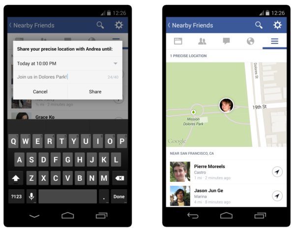 Nearby Friends là một tính năng tùy chọn trên ứng dụng Facebook dành cho Android và iOS. Chỉ khi nào dùng Nearby Friends, bạn bè của bạn mới được thông báo những lúc bạn ở gần họ, song bạn vẫn có thể chủ động chia sẻ vị trí chính xác của mình trên bản đồ cho một người khác mà không cần nhận lại vị trí chính xác trên bản đồ của người đó. Bạn có thể chọn mức độ riêng tư cho Nearby Friends giống như News Feed: chia sẻ vị trí với tất cả mọi người, vài người hoặc không ai cả.