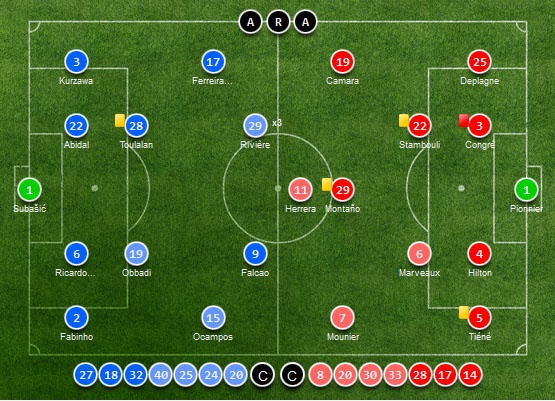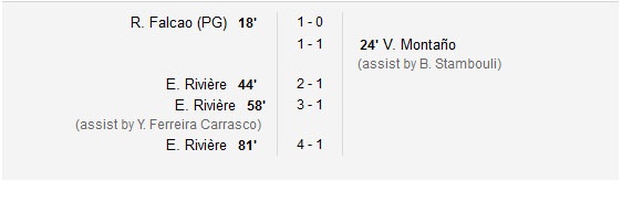 Sau những phút đầu liên tục ép sân nhưng không có được bàn thắng, đội chủ nhà đã bất ngờ được hưởng một quả 11m sau pha phạm lỗi của Tiéné với Ocampos và Falcao đã không mắc một sai lầm nào khi đối mặt với thủ thành Pionnier, mang về bàn thắng mở tỷ số.