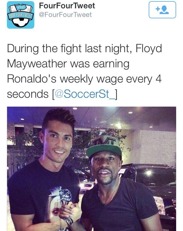 | Sau trận đấu với Manny Pacquiao, võ sĩ Mayweather chỉ cần 4 giây để bỏ túi khoản tiền bằng ngôi sao bóng đá Cristiano Ronaldo kiếm trong một tuần. |