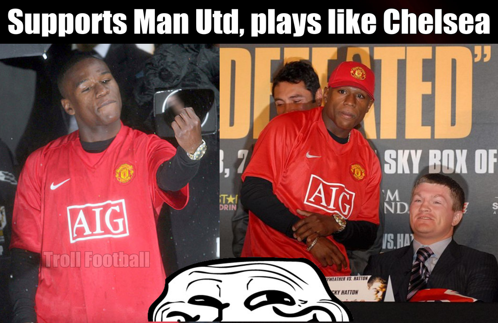 | Floyd Mayweather yêu thích đội bóng M.U, nhưng anh lại sử dụng lối chơi phòng ngự của Chelsea do HLV Mourinho dẫn dắt. |