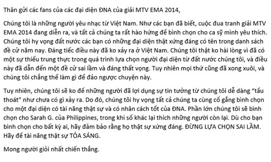 Sự việc bắt đầu căng thẳng với sự xuất hiện của một bức thư gửi cộng đồng fan đang bầu chọn EMA 2014 được viết bằng cả tiếng Anh và tiếng Việt.