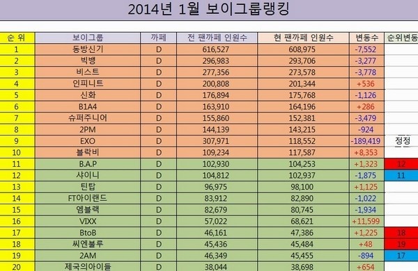 Trang Instiz vừa công bố số liệu thống kê mới nhất (đầu năm 2014) lượng fan trên các trang fancafe của các boygroup Kpop. Các nghệ sĩ SM và SS501 không có trang fancafe chính thức do đó số liệu trong BXH này được lấy từ các fancafe do fan lập. Khiến nhiều người chú ý nhất trong danh sách này chính là số lượng thành viên trên trang fancafe không chính thức của EXO. Theo đó, ban đầu trang này có tới 307.971 thành viên, nhưng đến nay chỉ còn 118.552 thành viên, giảm tới hơn một nửa (189.419).