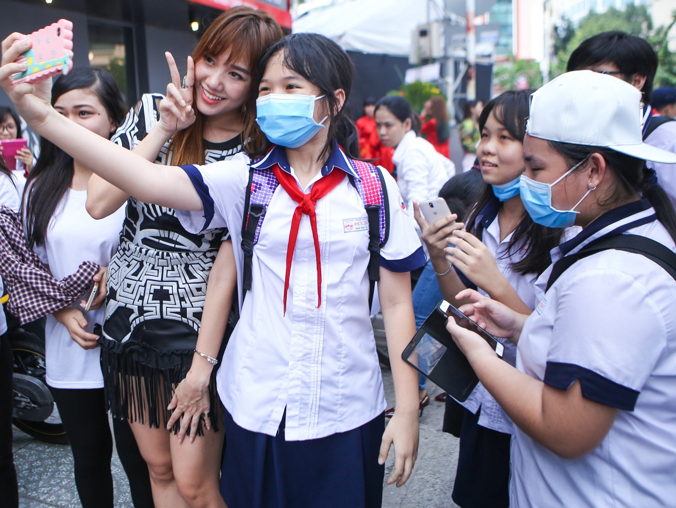 Thời gian gần đây Hari Won đẩy mạnh công việc ca hát. Bên cạnh lịch diễn và quay quảng cáo dày đặc, người đẹp xứ kim chi liên tục tung ra sản phẩm âm nhạc mới. Mặc dù thời tiết Sài Gòn nắng nóng gay gắt nhưng các em học sinh, người hâm mộ vẫn "đội nắng" cổ vũ cô.