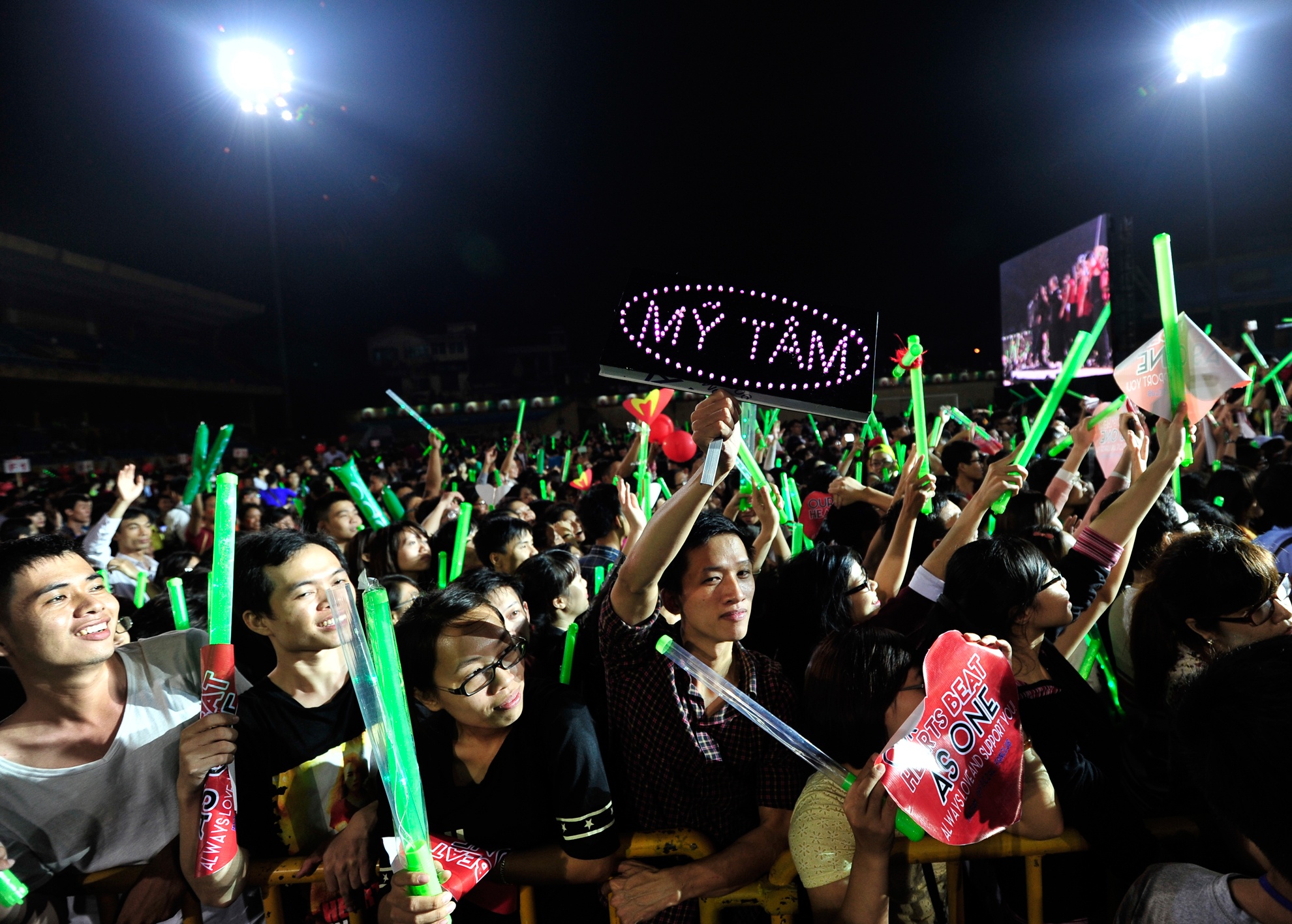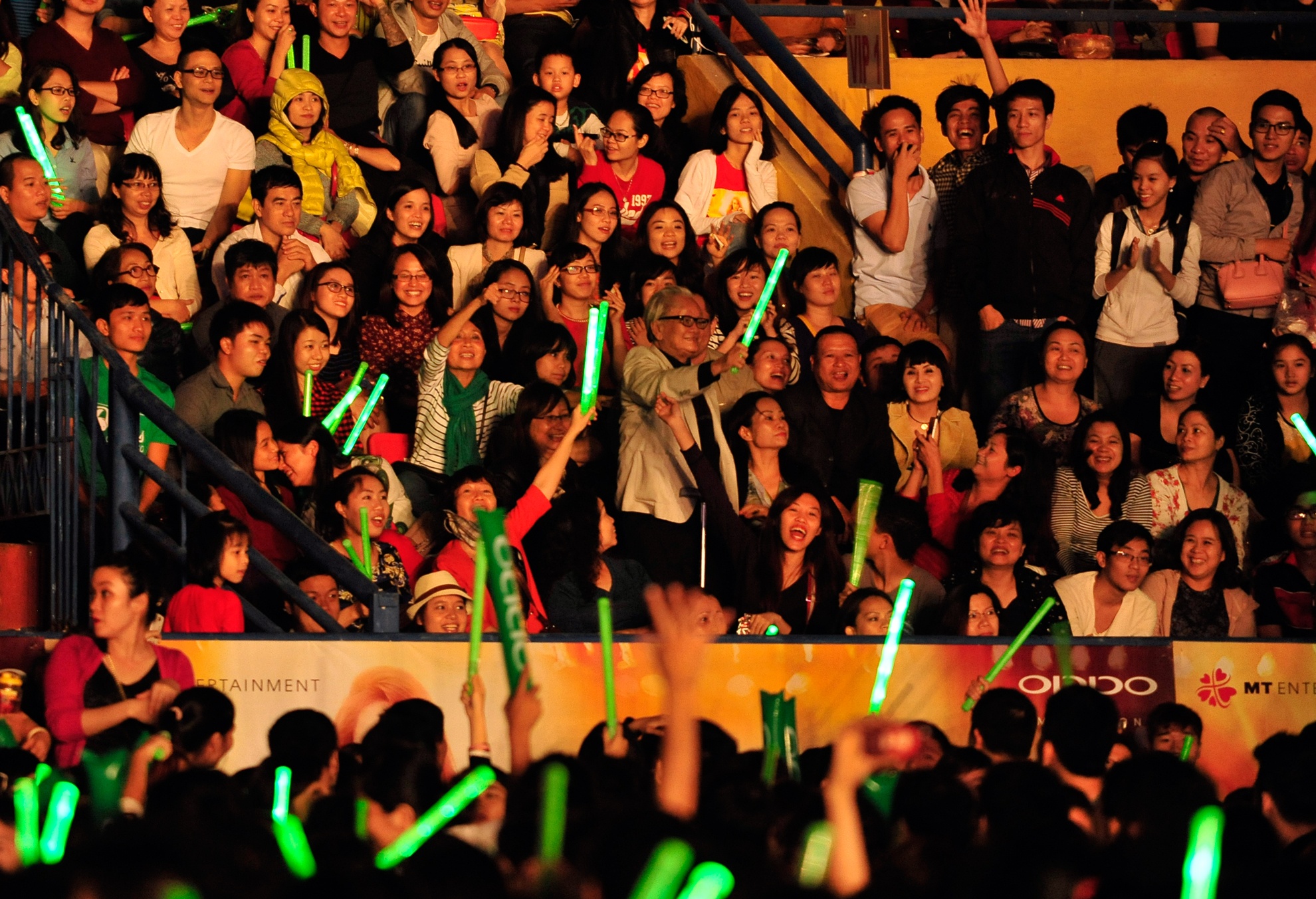 | Theo lời chia sẻ của Mỹ Tâm, có khoảng 25.000 khán giả đã đổ về sân vận động Hàng Đẫy để chung vui cùng cô. Trên khu vực khán đài, nhạc sĩ Hồng Đăng (áo vest trắng) và cả những người luống tuổi cũng hò reo, cổ vũ nhiệt tình trước những màn trình diễn đỉnh cao của nữ ca sĩ. |