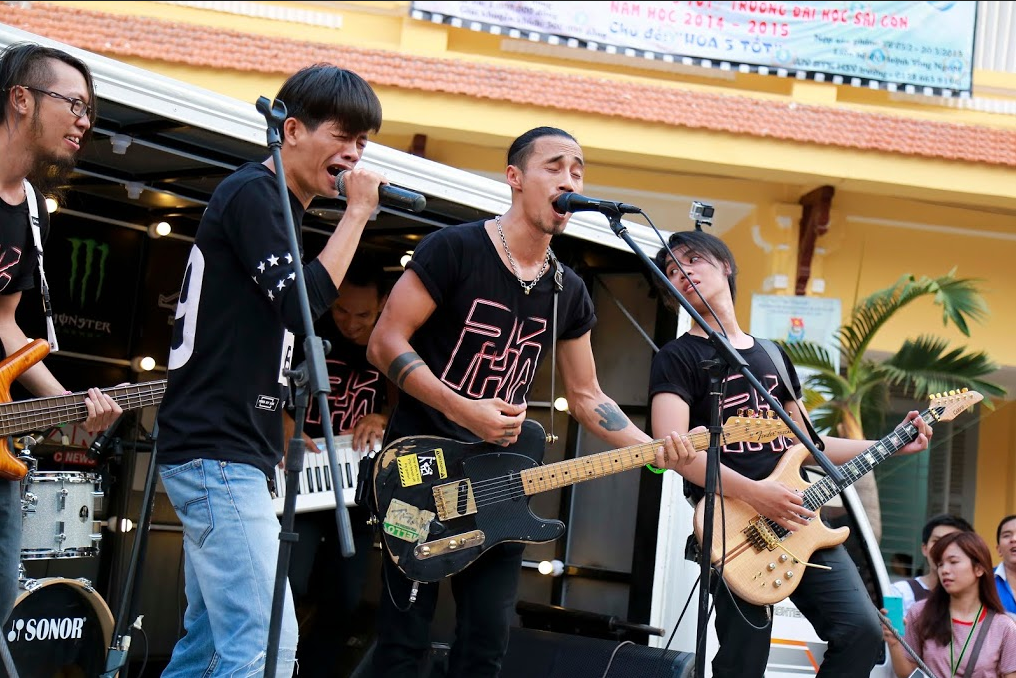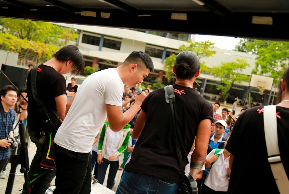 | Tại Đại học Sài Gòn, hơn 1.000 sinh viên đã xếp hàng tại sân khấu trước giờ G để chờ xem những màn biểu diễn rock lạ lẫm của PAK Band trên chiếc xe tải. Hình ảnh một Phạm Anh Khoa cháy hết mình cùng rock luôn là điều khiến khán giả yêu thích chàng trai này. |
