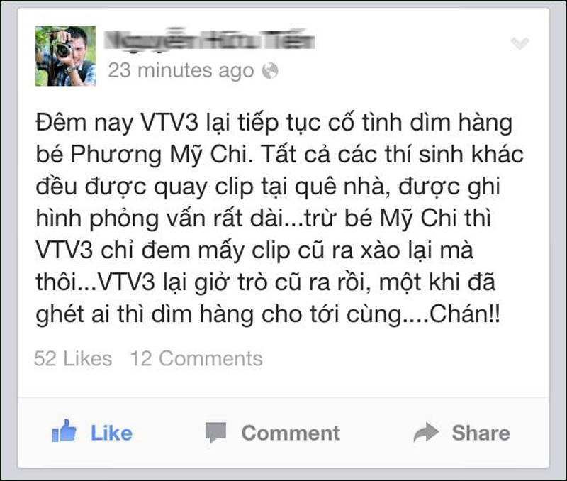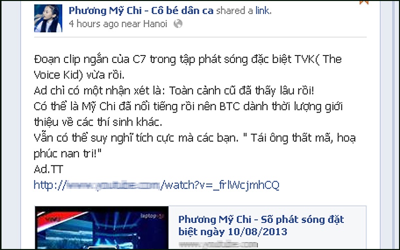 Trước những thắc mắc của bạn bè trên trang cá nhân về chuyện "dìm hàng" này, vị khán giả nói trên còn phân tích khá kỹ lưỡng: "Các thí sinh khác thì quay rất kỹ, thậm chí dựng lại cảnh thí sinh bị bệnh viêm màng não nằm viện từ thuở đâu đâu... Phỏng vấn người nhà, hàng xóm, bác sĩ, kéo dài mấy chục phút luôn...Còn bé Mỹ Chi chỉ nói sơ sài vài câu, lấy mấy clip cũ ra chiếu lại chút xíu là xong".