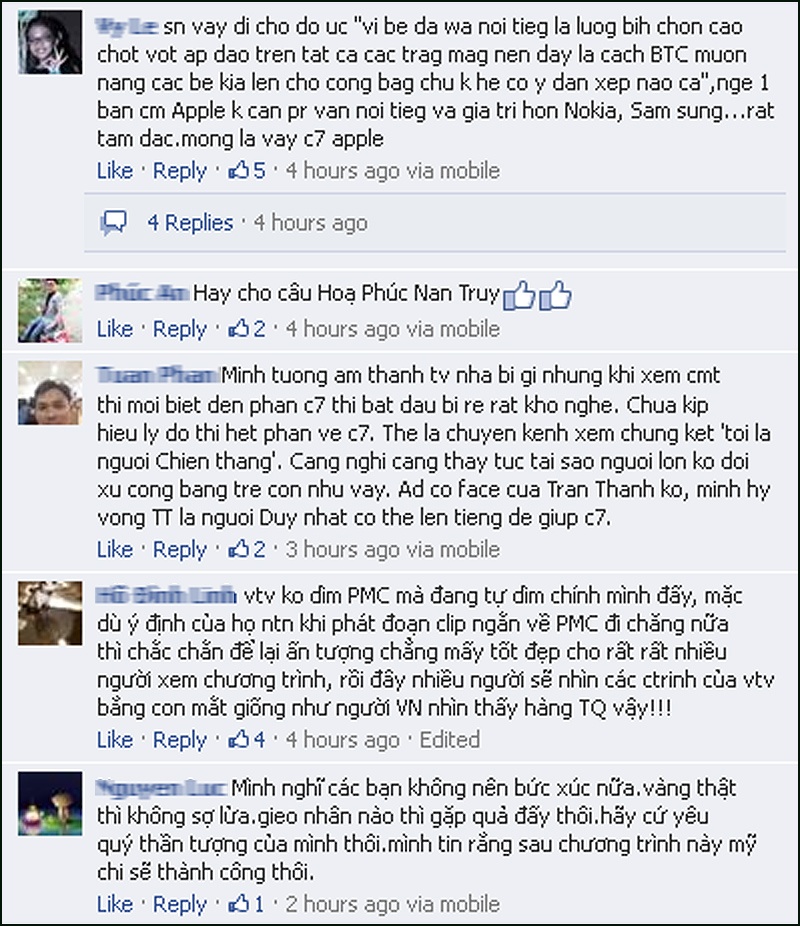 Ủng hộ cách nhìn này, có bạn chia sẻ: "Suy nghĩ vậy đi cho đỡ ức: "Vì bé đã quá nổi tiếng, lượng bình chọn cao chót vót áp đảo trên tất cả các trang mạng nên đây là cách BTC muốn nâng các bé kia lên cho công bằng chứ không hề có ý dàn xếp nào cả". Vị khán giả này còn ví von một cách hài hước: "Apple không cần PR vẫn nổi tiếng và giá trị hơn Nokia, Samsung... Rất tâm đắc! Mong là vậy, chị Bảy Apple".
