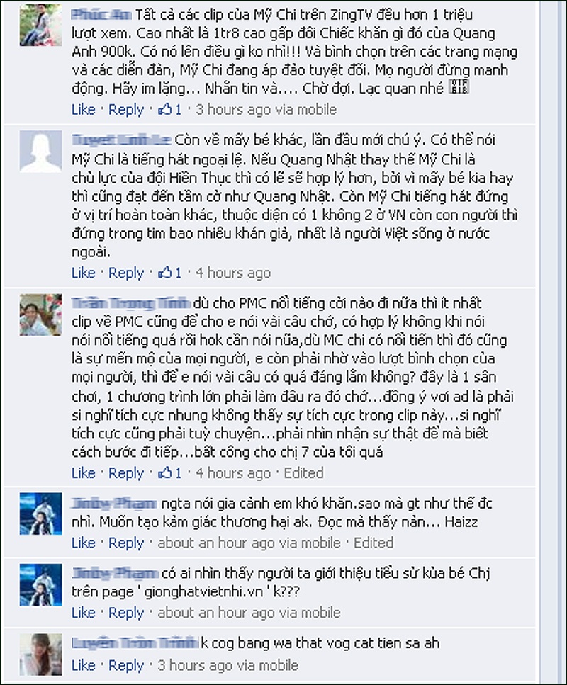 Một khán giả khác lại tỏ ra khá sắc sảo khi phân tích cả các số liệu về lượt xem video của Phương Mỹ Chi trên các trang chia sẻ: "Tất cả các clip của Mỹ Chi trên Zing TV đều hơn 1 triệu lượt xem. Cao nhất là 1,8 triệu, cao gấp đôi Chiếc khăn gì đó của Quang Anh 900 nghìn. Có nói lên điều gì không nhỉ? Và bình chọn trên các trang mạng và các diễn đàn, Mỹ Chi đang áp đảo tuyệt đối. Mọi người đừng manh động. Hãy im lặng... Nhắn tin và.... Chờ đợi. Lạc quan nhé".