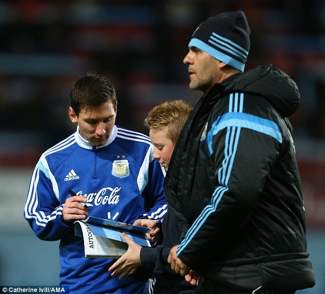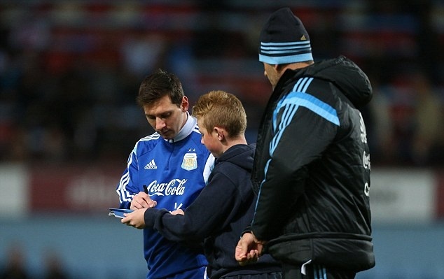 | Trong trận giao hữu giữa Argentina và Croatia trên sân Upton Park, một CĐV nhí của West Ham đã chạy xuống sân xin chữ ký của tiền đạo Lionel Messi. |