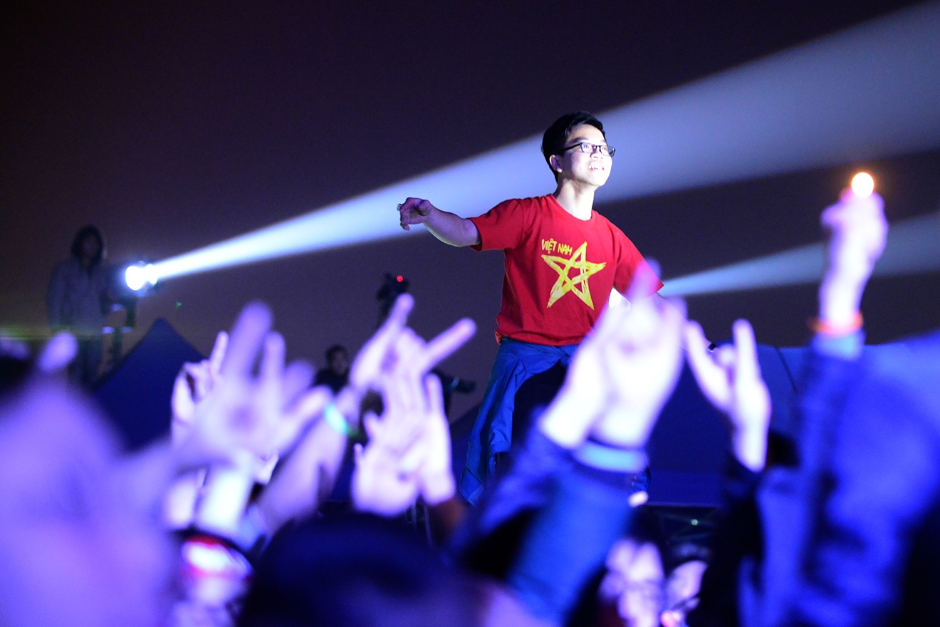 | ... trước khi hàng ngàn khán giả đứng nghiêm trang, đặt tay lên trái tim và hòa mình vào giai điệu Quốc ca khi nhóm Ngũ cung thể hiện ca khúc Gió bấc. |