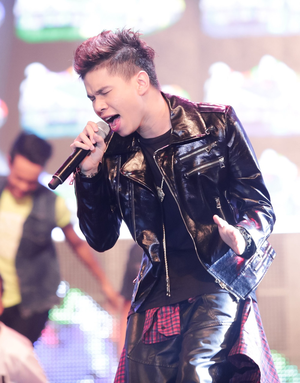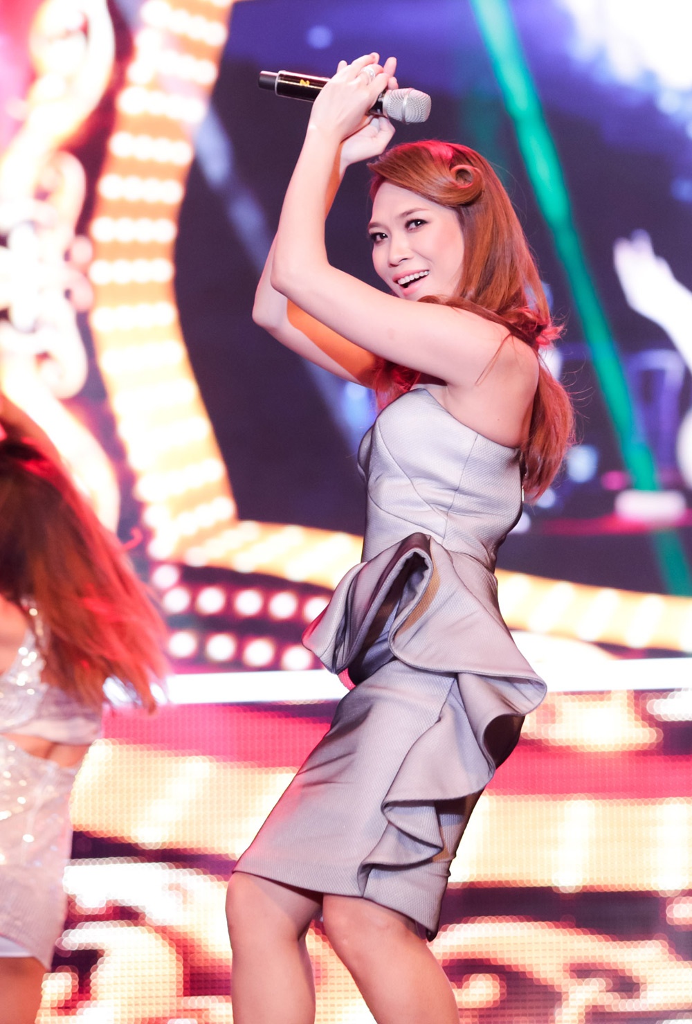 | Gà cưng của Mỹ Linh ăn mặc cá tính, cháy hết mình trên sân khấu. |