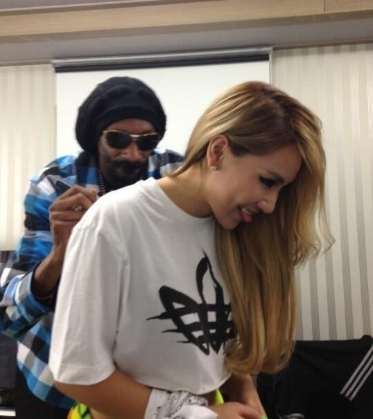| Thích thú để Snoop Dogg ký tên lên áo. Trong chuyến công du tới Hàn Quốc, Snoop Dogg đã gặp gỡ rất nhiều nghệ sĩ nhà YG, trong đó có 2NE1 và CL. |