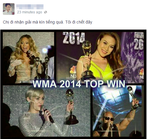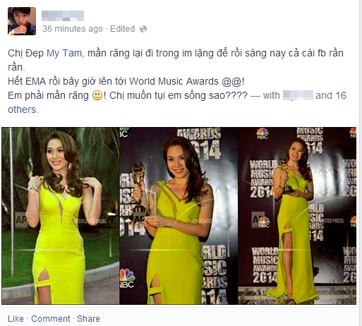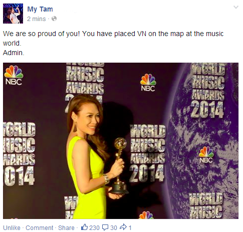 | Trang chính thức của Mỹ Tâm chia sẻ hình ảnh cô cầm trên tay chiếc cúp danh giá kèm theo lời bình luận: "Chúng tôi rất tự hào về chị. Chị đã ghi tên Việt Nam lên bản đồ âm nhạc thế giới". |