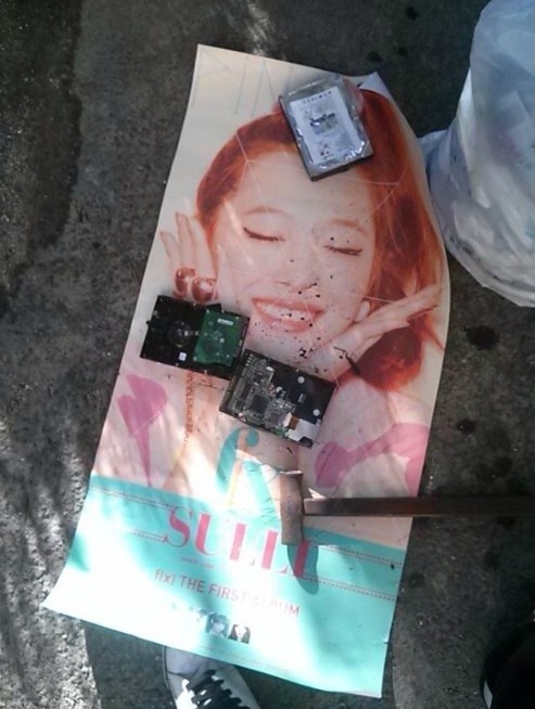 Mới đây, trên trang Instiz, một fanboy cuồng nhiệt của f(x) đã chia sẻ một số ảnh chụp, trong đó anh ta cắt nát và thậm chí đốt hình của Sulli. Người này nhận là fan trung thành của nhóm f(x), đã theo dõi từng bước chân của nhóm trong suốt 5 năm qua. Trên diễn đàn hâm mộ f(x), lịch sử tài khoản của anh ta có hơn 750.000 lời bình luận. Giờ đây, cùng với hành động đốt ảnh, tài khoản được đổi tên thành “Not a Sulli fan” (Không phải fan của Sulli)