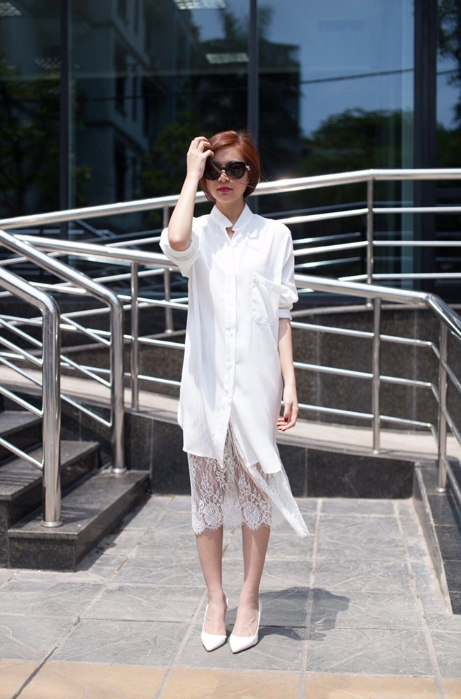 Áo sơ-mi dáng dài: Xu hướng thời trang "giấu quần" duy trì sức ảnh hưởng vào mùa hè 2015. Tuy không đình đám như năm ngoái, song mốt áo dài năm nay lại có những đặc trưng khá thú vị. Dáng áo được ưa chuộng chủ yếu là sơ-mi trắng, kết hợp cùng chất liệu ren mềm mại. Trong ảnh là Hoàng Thuỳ Linh.