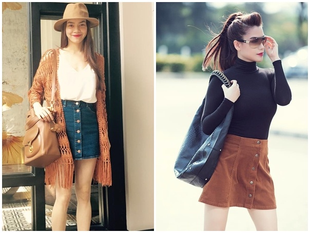 Chân váy cài cúc trước: Mốt váy cài cúc trước mang đậm phong cách thập niên 1970 đang được các tín đồ thời trang săn đón. Đi tiên phong ứng dụng trào lưu này là ca sĩ Tóc Tiên. Người đẹp hải ngoại diện chân váy cá tính vào tháng 3. Xu hướng tiếp tục được Hồ Ngọc Hà và Trương Ngọc Ánh ứng dụng khi tản bộ trên phố vào trung tuần tháng 4.
