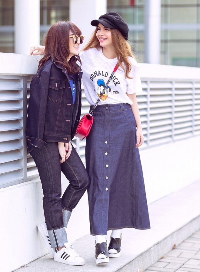 Chân váy cài cúc trước có nhiều kiểu ngắn dài khác nhau. Phiên bản váy dài denim mang nét đặc trưng cổ điển, được ưa chuộng vào những năm 1970. Ngày 18/4, ca sĩ Yến Trang thử nghiệm xu hướng hot với cách mix đơn giản cùng áo thun.