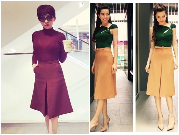 Chân váy một ly giữa: Dáng vẻ thanh lịch, tối giản giúp váy một ly đối xứng trở thành một trong những xu hướng hot nhất mùa hè 2015. Hồ Ngọc Hà và Tóc Tiên là hai icon Vbiz đầu tiên sở hữu kiểu mốt này. Bà mẹ một con diện khi tham dự buổi họp báo cuối tháng 3, còn ca sĩ hải ngoại sử dụng trong chuyến du lịch nước ngoài mới đây.