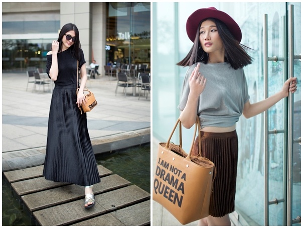 Váy xếp ly: Chân váy xếp ly mang nét đặc trưng của phong cách cổ điển, được yêu thích ở thập niên 1990. Xu hướng trở lại với làng thời trang Việt vào mùa hè 2015. Kha Mỹ Vân đón đầu phong cách hè đậm tính ứng dụng cao với mốt váy xếp ly dài, ngắn tông trầm dễ mix phụ kiện.