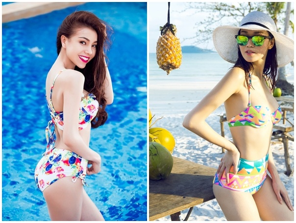 Bikini họa tiết sặc sỡ: Bikini hè 2015 mang hơi thở năng động và náo nhiệt nhờ sắc màu và họa tiết sặc sỡ. Những cô gái gợi cảm, trẻ trung như Trà Ngọc Hằng, Khánh My rất chuộng phong cách này.