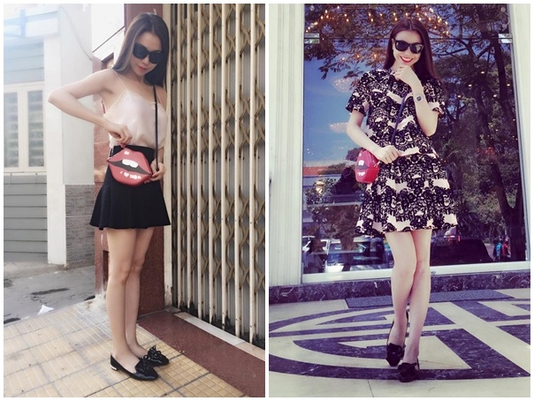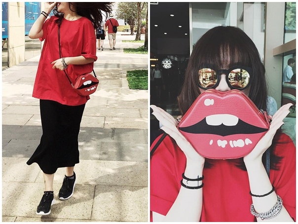 Nữ ca sĩ - người mẫu nhanh nhạy mix túi đôi môi với loạt trang phục đường phố. Nhiều người tiêu dùng khen ngợi khả năng linh động, dễ dàng phù hợp với nhiều phong cách của xu hướng này.