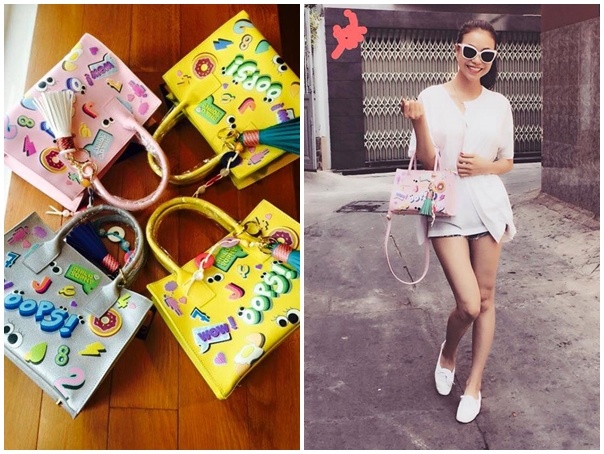 Mẫu túi có kiểu dáng thanh lịch được trang trí bởi những hình vẽ tinh nghịch được Yến Trang - Yến Nhi ưa chuộng, kết đôi nổi bật cùng bộ cánh pastel nhã nhặn.