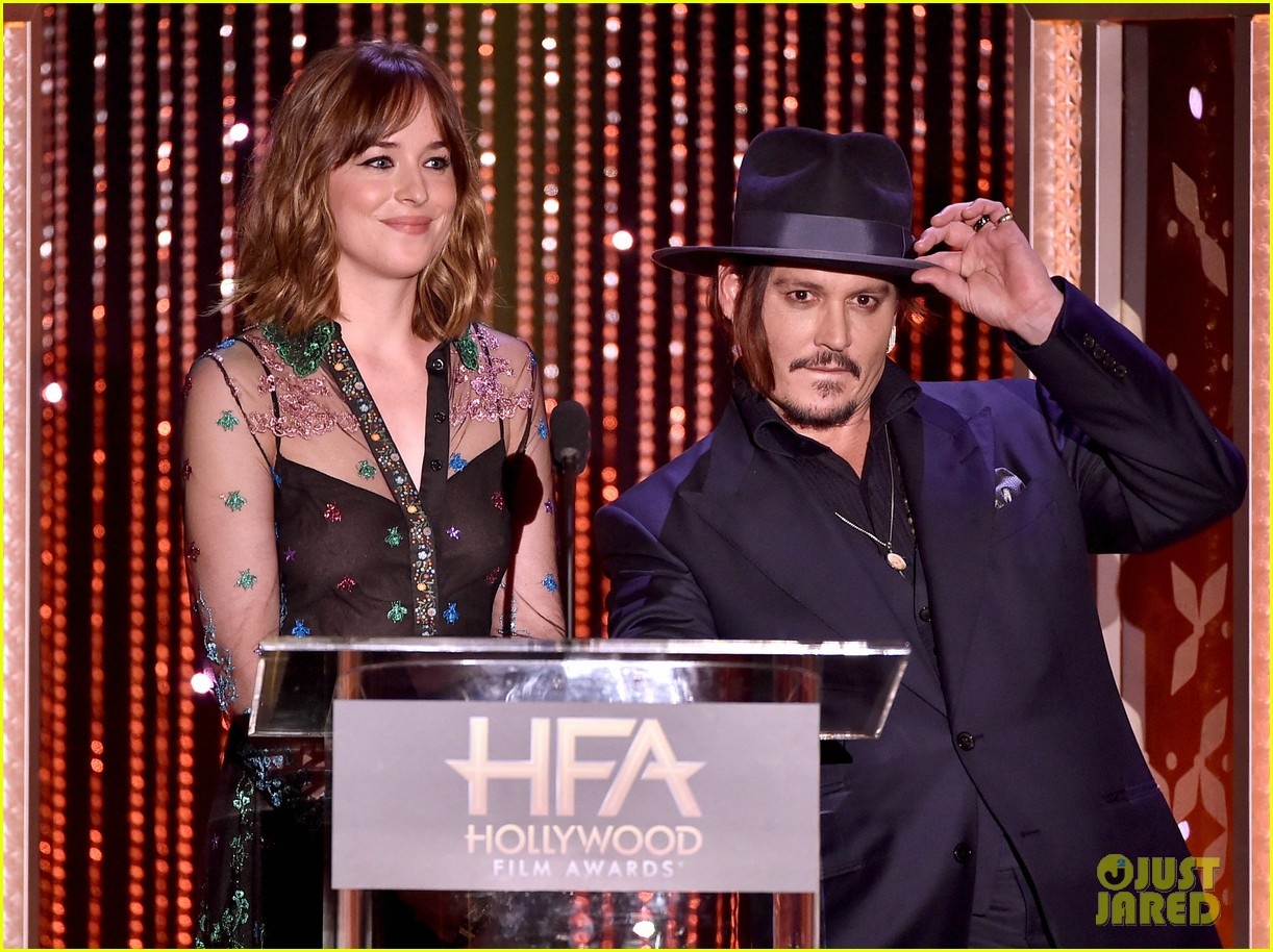 | Johnny Depp bên cạnh bạn diễn Dakota Johnson trong Black Mass trên sân khấu trao giải thưởng HFA 2015. Năm ngoái, cũng tại đây, anh từng có màn phát biểu khi đang say xỉn. |