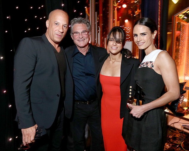 | Vin Diesel bên cạnh các bạn diễn Kurt Russell, Michelle Rodriguez và Jordana Brewster tại lễ trao giải thưởng điện ảnh Hollywood Film Awards 2015. |