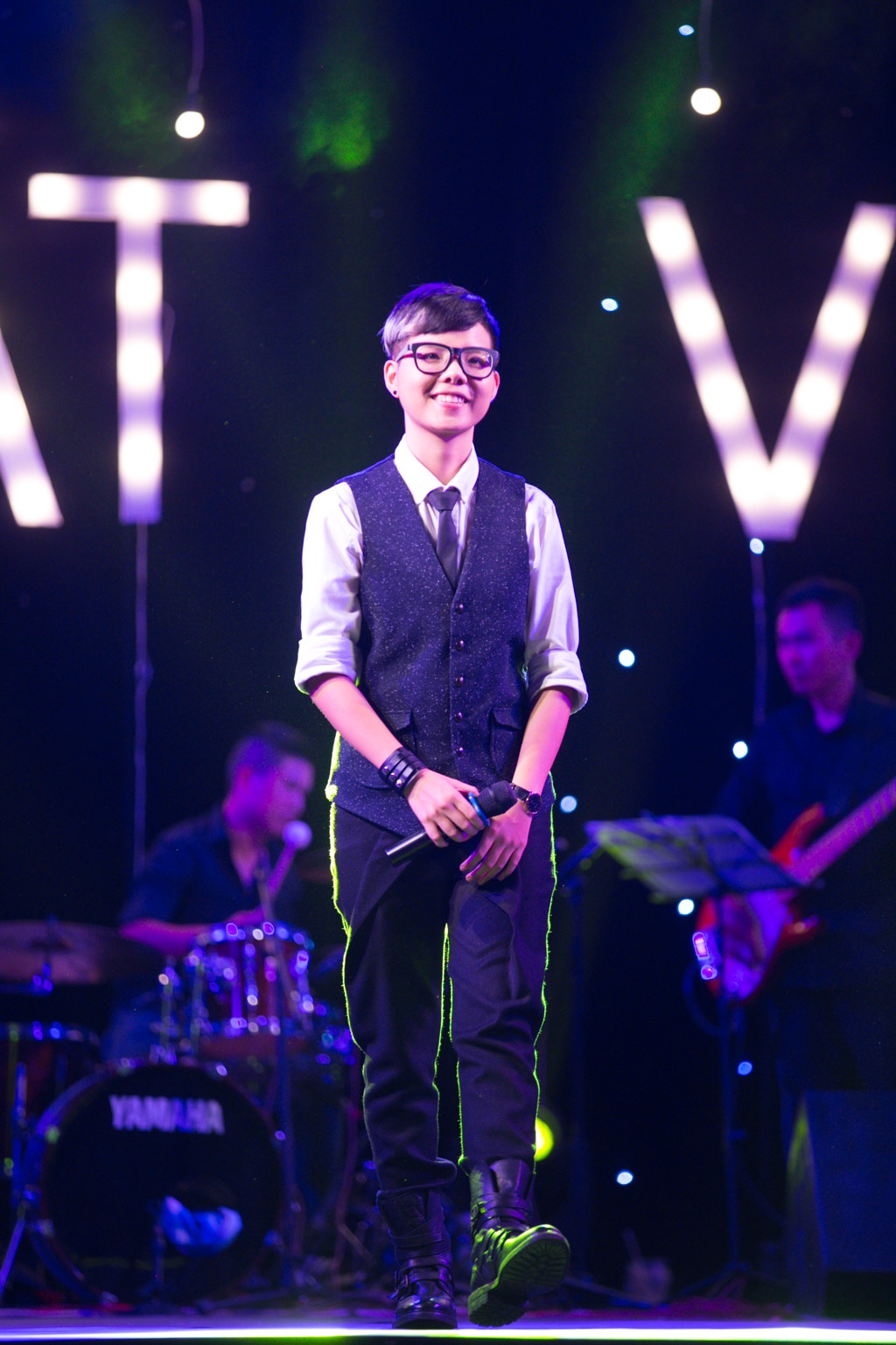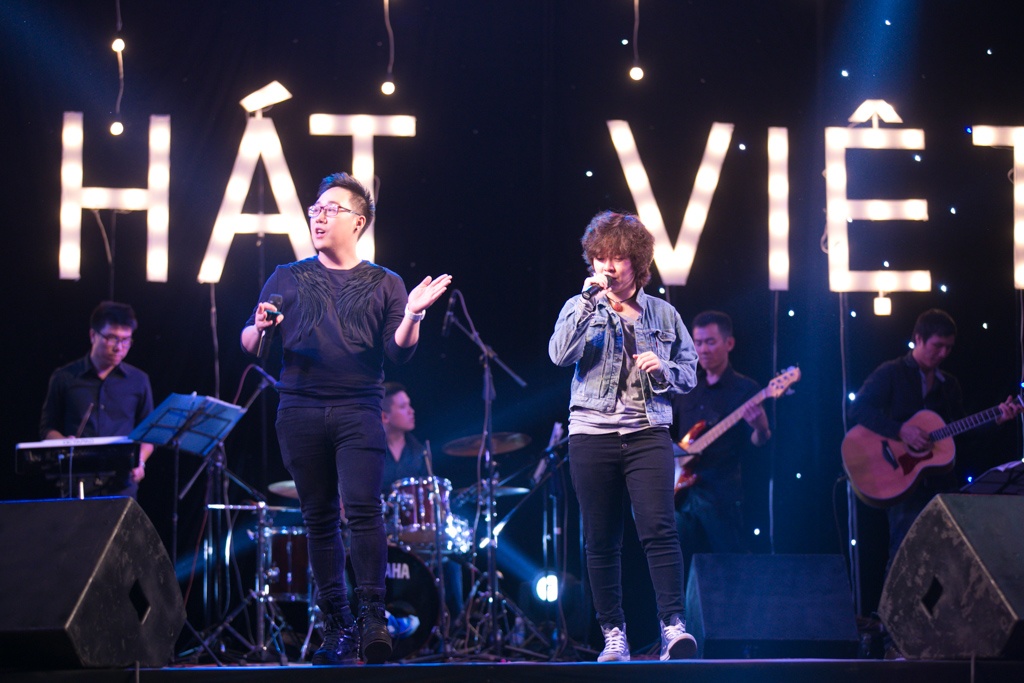 | Vũ Cát Tường cũng xuất hiện trong đêm gala với vai trò ca sĩ và đội trưởng của ĐH Hồng Bàng. |