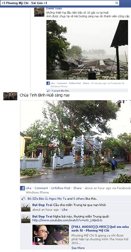 Chiều nay (30/9), cơn bão số 10 có tên Wutip – Con bướm chính thức đổ bộ vào các tỉnh miền Trung. Sau khi nắm được thông tin đây là cơn bão mạnh nhất trong vòng 6 năm qua, những người yêu mến tiếng hát Phương Mỹ Chi đã nhanh chóng ra sức vận động các thành viên trong fan club cũng như tất cả ai có lòng hảo tâm cùng đóng góp, ủng hộ cho đồng bào miền Trung.