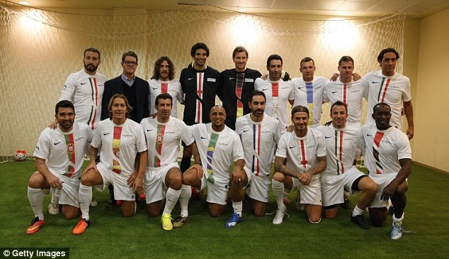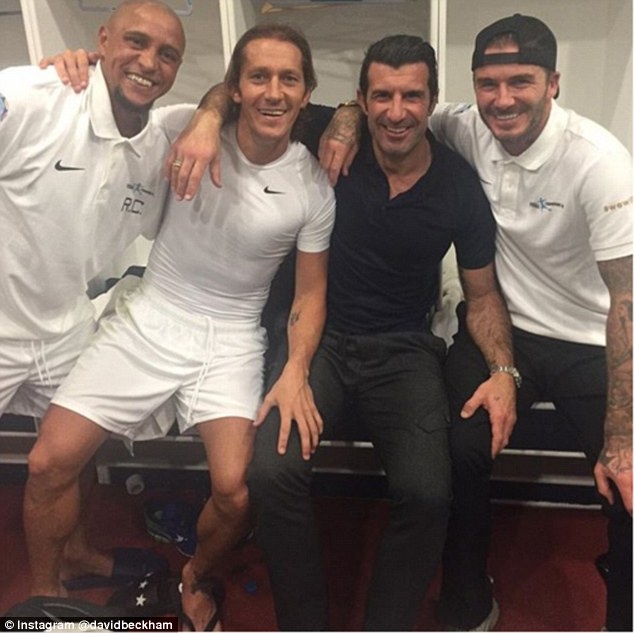 David Beckham (phải) chụp ảnh lưu niệm với 3 đồng đội cũ ở Real Madrid gồm Roberto Carlos, Michel Salgado và Luis Figo (từ trái qua phải) sau khi trận đấu kết thúc.