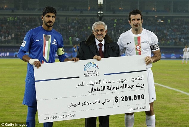 Thủ quân Musaed Neda của đội Ngôi sao Kuwait chụp ảnh lưu niệm với đội trưởng Luis Figo (Ngôi sao thế giới) cùng tấm biển in số tiền 200.000 USD của nhà tài trợ cho trận giao hữu. Đây là trận đấu đầu tiên trong khuôn khổ giải Football Champions Tour.