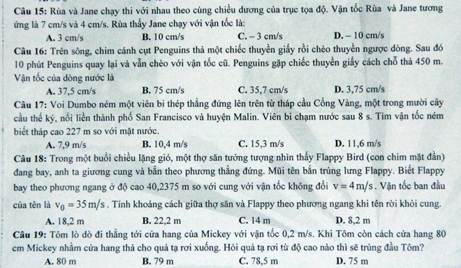 Khác với những câu hỏi vốn khô khan, mô phạm thường thấy, ngôn ngữ trong đề Vật lý này còn rất hài hước như chú rùa (trong chuyện ngụ ngôn rùa và thỏ) lại chạy thi với Jane (nhân vật trong truyện Tarzan), hay "hỏi quả tạ rơi từ độ cao nào sẽ trúng đầu Tôm?".