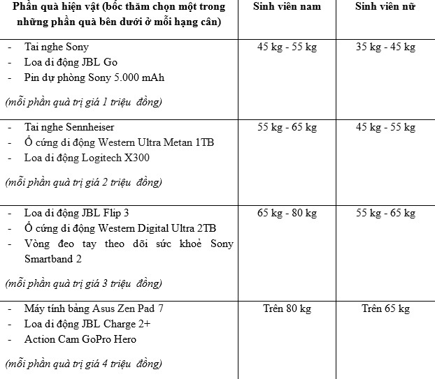 Lưu ý: các phần quà hiện vật có thể thay thế bằng các phần quà khác trong cùng hạng cân nếu hết hàng.