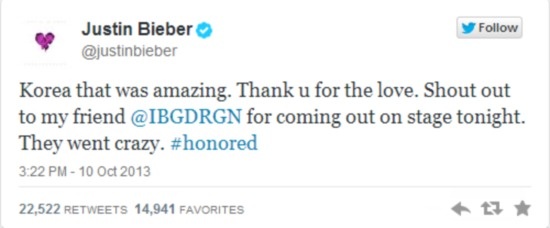 | Những dòng chia sẻ trên Twitter của Justin Bieber dành cho G-Dragon sau khi liveshow kết thúc. |