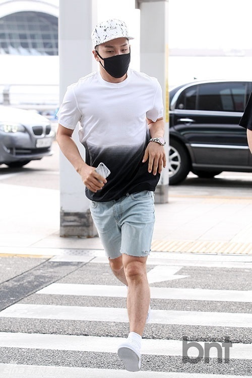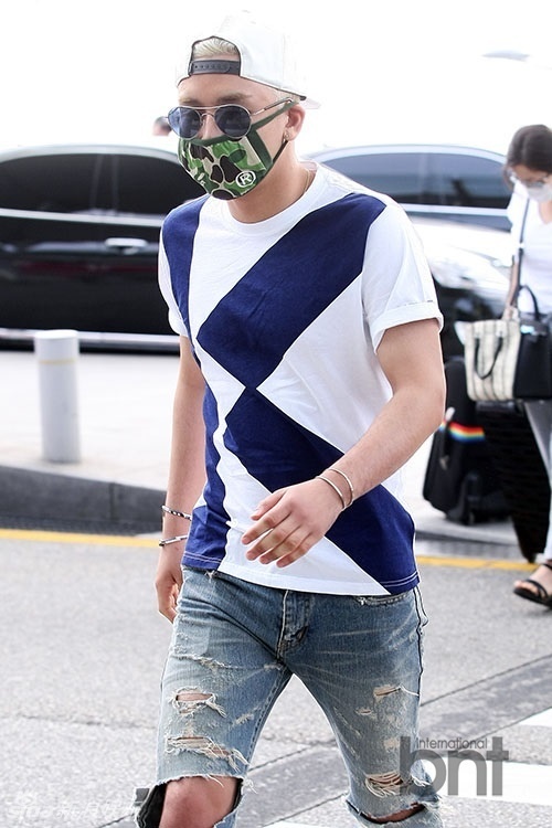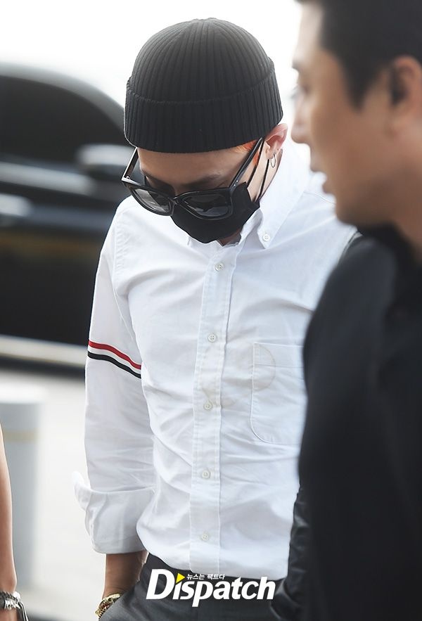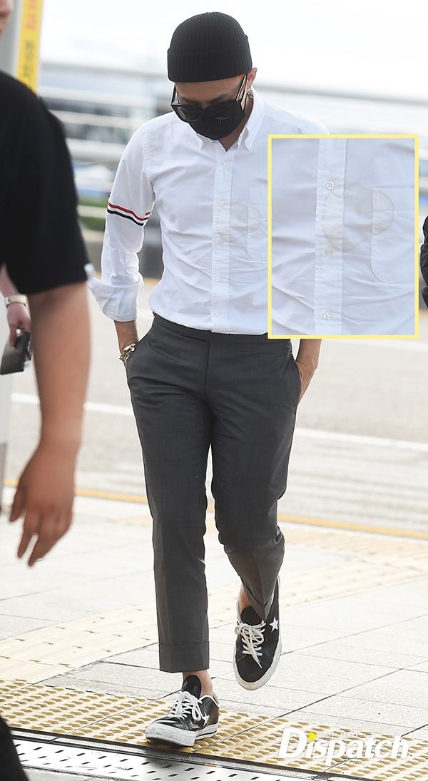| Các chàng trai xuất hiện ở sân bay với khẩu trang che kín mặt. Kết hợp áo trắng với quần âu, G-Dragon trông khá lịch lãm. Tuy nhiên, anh chàng cũng nhanh chóng "mất điểm" khi để lộ vết ố vàng khá rõ trên áo. |
