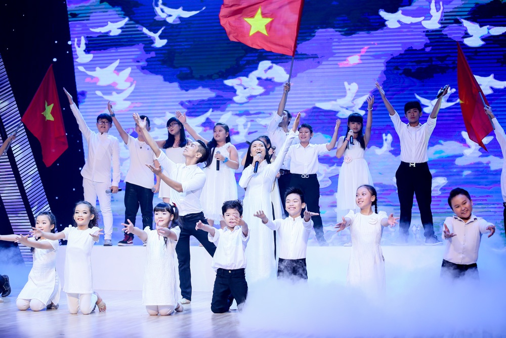 | Đoan Trang mang các thí sinh từng bị loại và 2 thí sinh lọt vào chung kết trình diễn ca khúc Tự nguyện. |