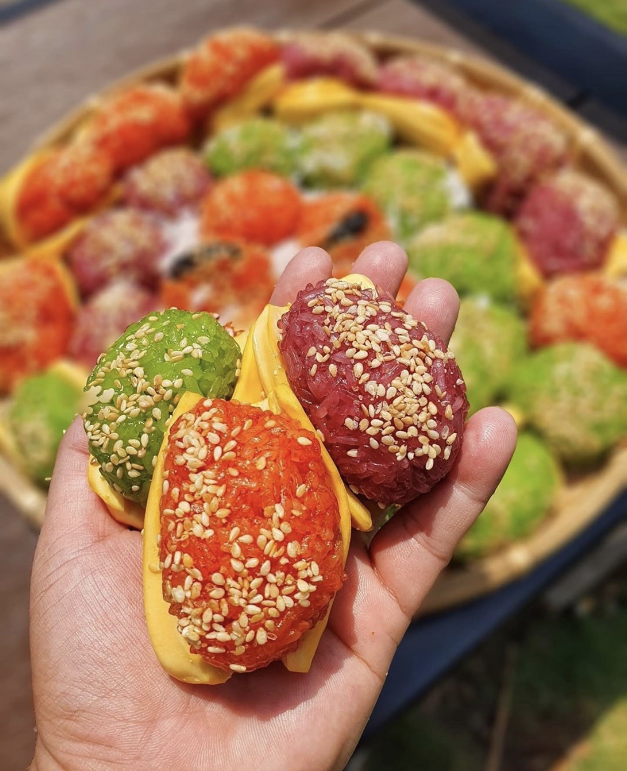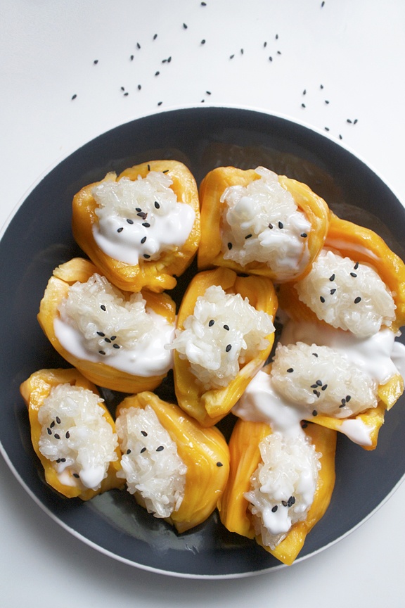 | Xôi mít với sắc màu bắt mắt là một trong những món ăn chuẩn vị Thái Lan được giới trẻ ưa chuộng. Phần xôi nếp dẻo được nhồi trong múi mít đã tách hột và rắc thêm đậu phộng, mè, dừa nạo cùng nước cốt dừa thơm béo. Đây là hương vị lý tưởng cho những tín đồ hảo ngọt, hảo nếp. Ảnh: Hoanglam.foodie, Shesimmers. |