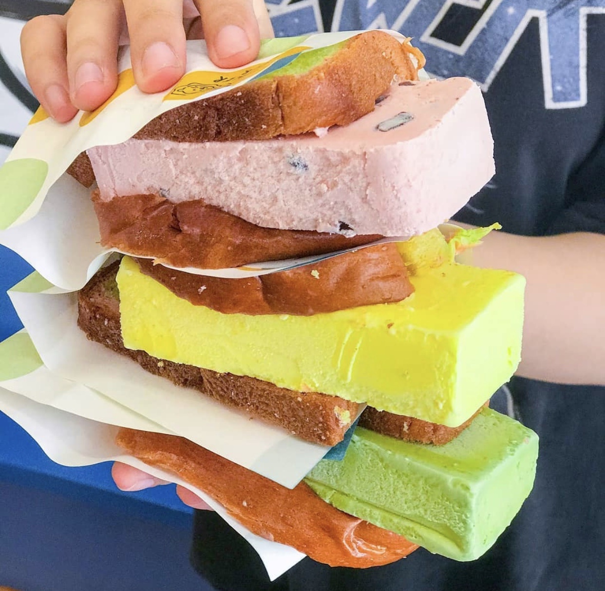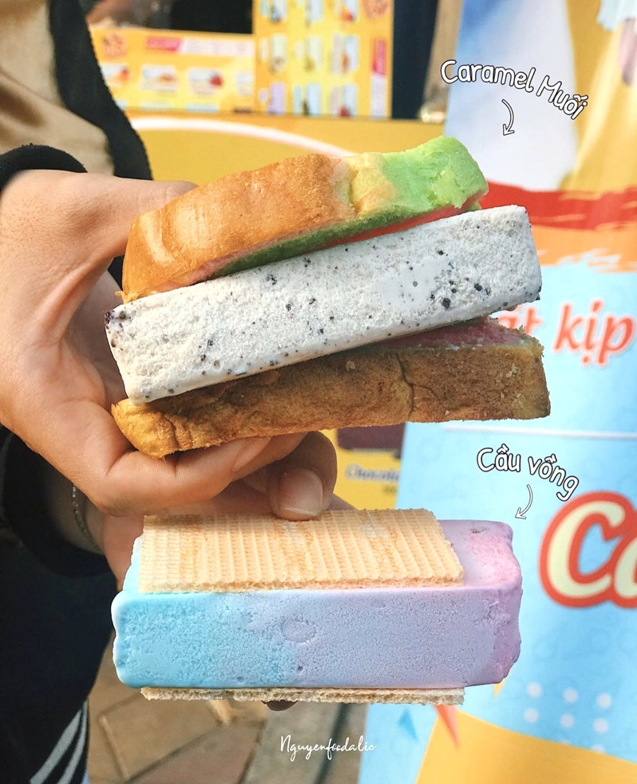 | Kem là món tráng miệng đốn tim giới trẻ bất kể mùa nào trong năm. Tại TP.HCM, bạn đừng bỏ lỡ cơ hội trải nghiệm bánh mì kẹp kem độc đáo, lạ vị. Món ăn đường phố này có xuất xứ từ Singapore. Bạn có thể chọn loại bánh kẹp waffle giòn tan hay sandwich mềm mại để kết hợp cùng các vị kem tự chọn. Vị chocolate, bạc hà, sầu riêng, trái cây, thạch dừa, phúc bồn tử hay vanilla mang lại độ béo ngọt khác nhau. Ảnh: Hawkestar_hcm, Nguyenfoodalic. |
