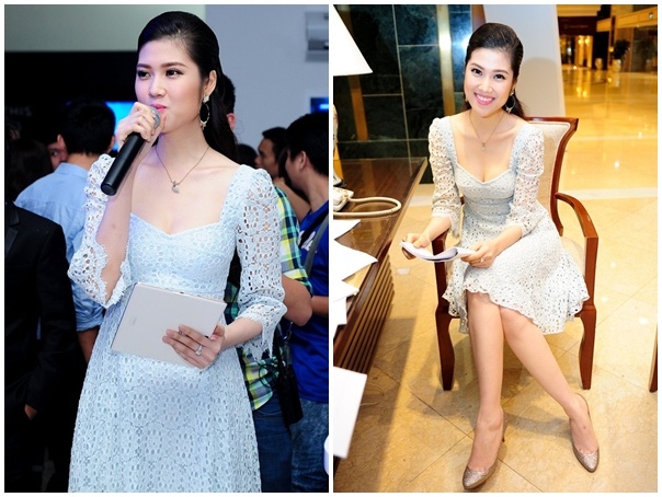 | Đảm nhận vai trò MC của một sự kiện, Thu Hằng ghi điểm thời trang nhờ bộ trang phục đơn giản, thanh lịch. Mốt váy ren nữ tính cũng rất phù hợp với phong cách nhẹ nhàng, duyên dáng của nữ người mẫu. |