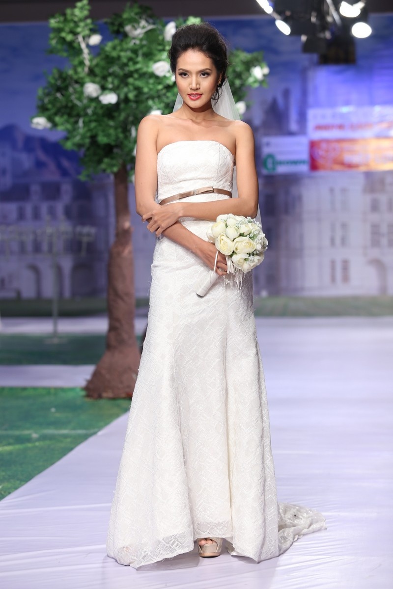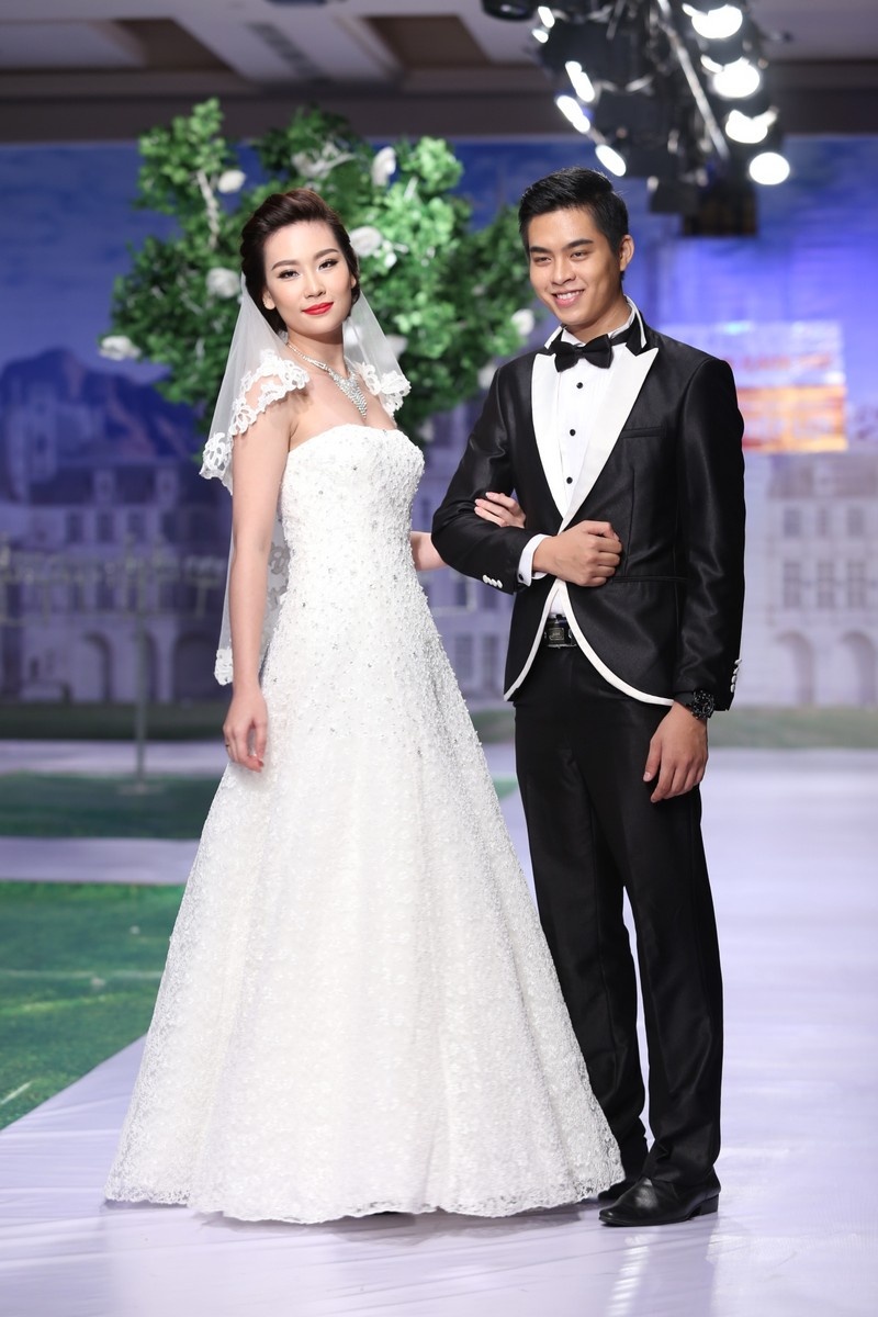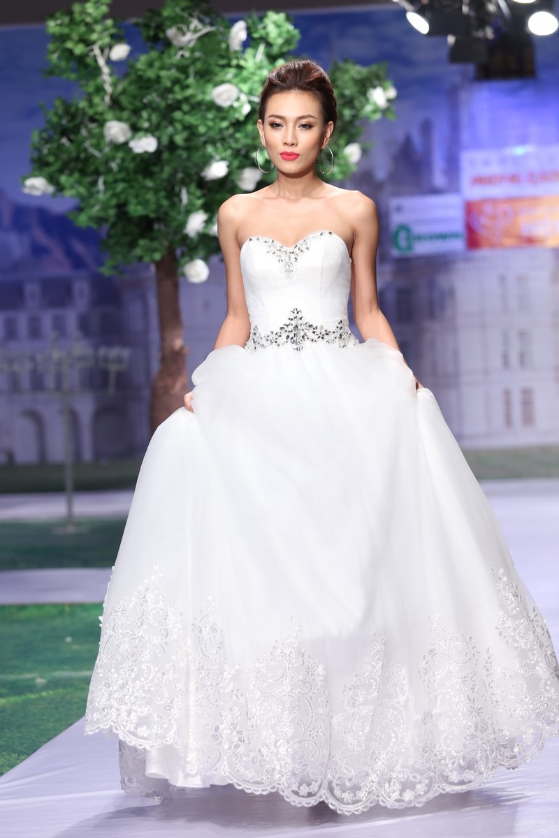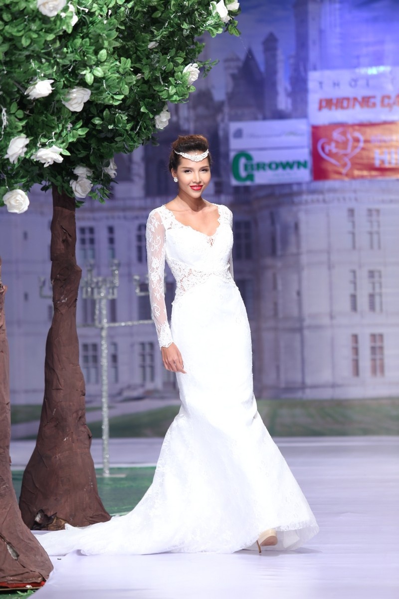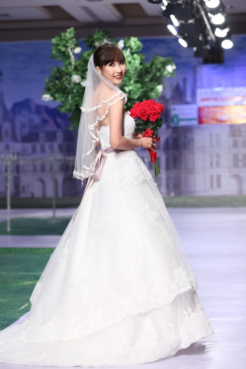 Diệu Huyền nền nã khi trình diễn mẫu đầm cưới gam màu trắng, chất liệu ren nhã nhặn.