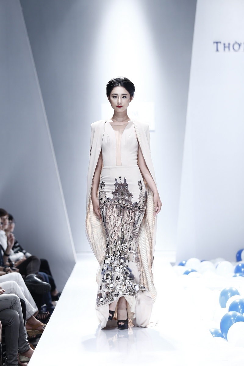 Chất liệu chính là lụa Việt Nam kết hợp với những đường nét thêu kết tinh xảo, nhà thiết kế Võ Công Khanh mang đến bộ sưu tập thời trang khắc họa về lâu đài Chambord qua hình ảnh kiến trúc cùng những hoa văn chạm khắc trên các bức tượng phù điêu.