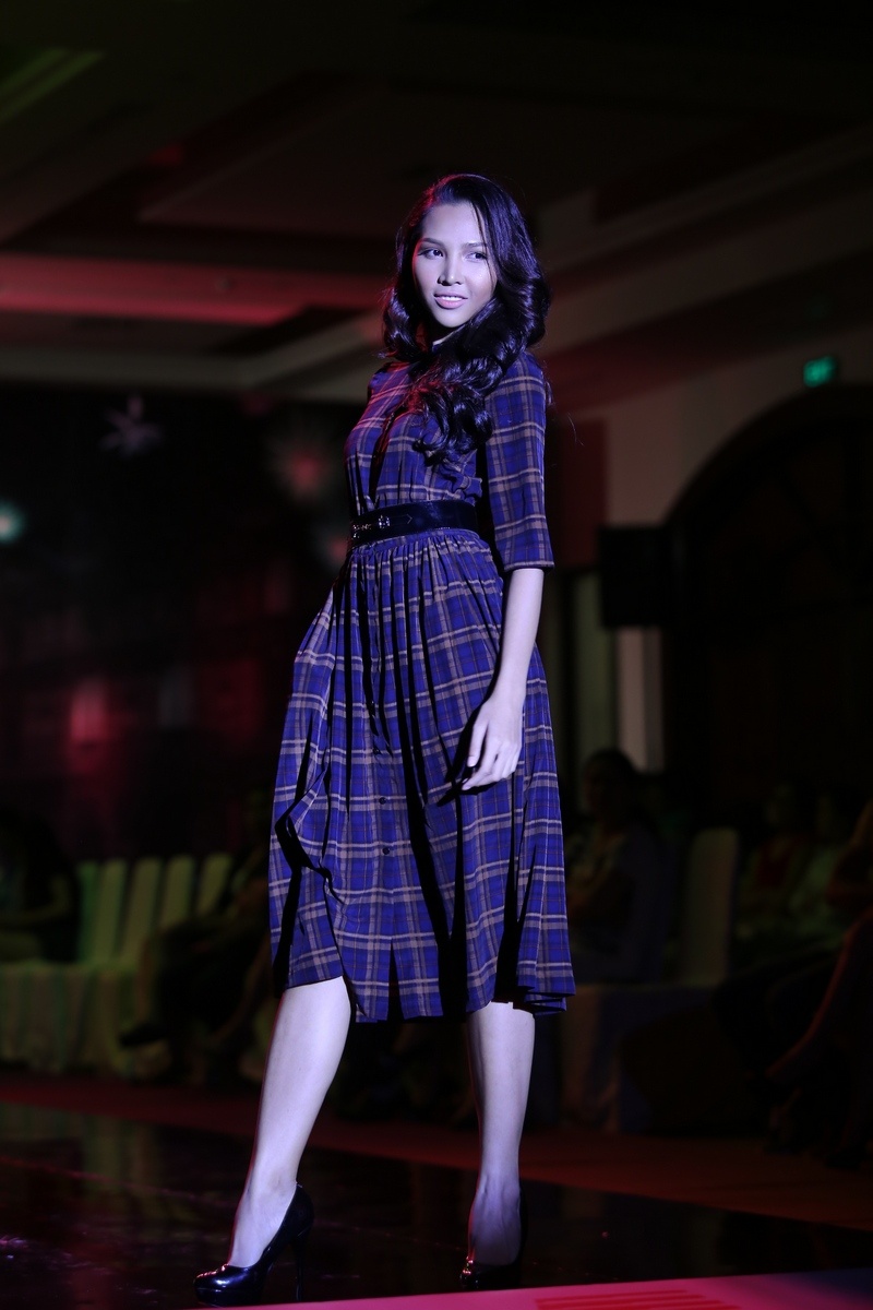 | Minh Triệu cổ điển với váy dài tông màu trầm, họa tiết ca rô hiện đại. |