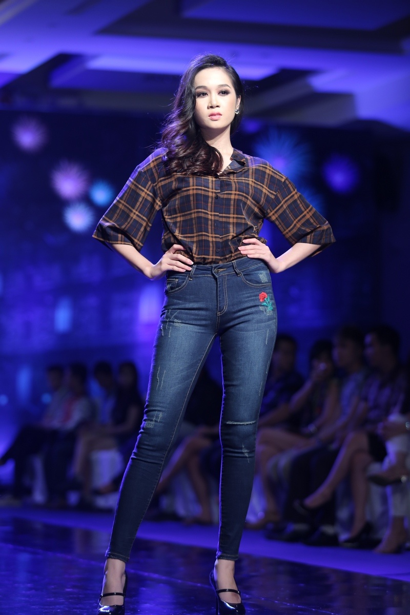 Trang phục trẻ trung và không kém phần đáng yêu với cách phối đơn giản, quần jean và áo sơ mi tay lỡ, cổ áo cánh sen.