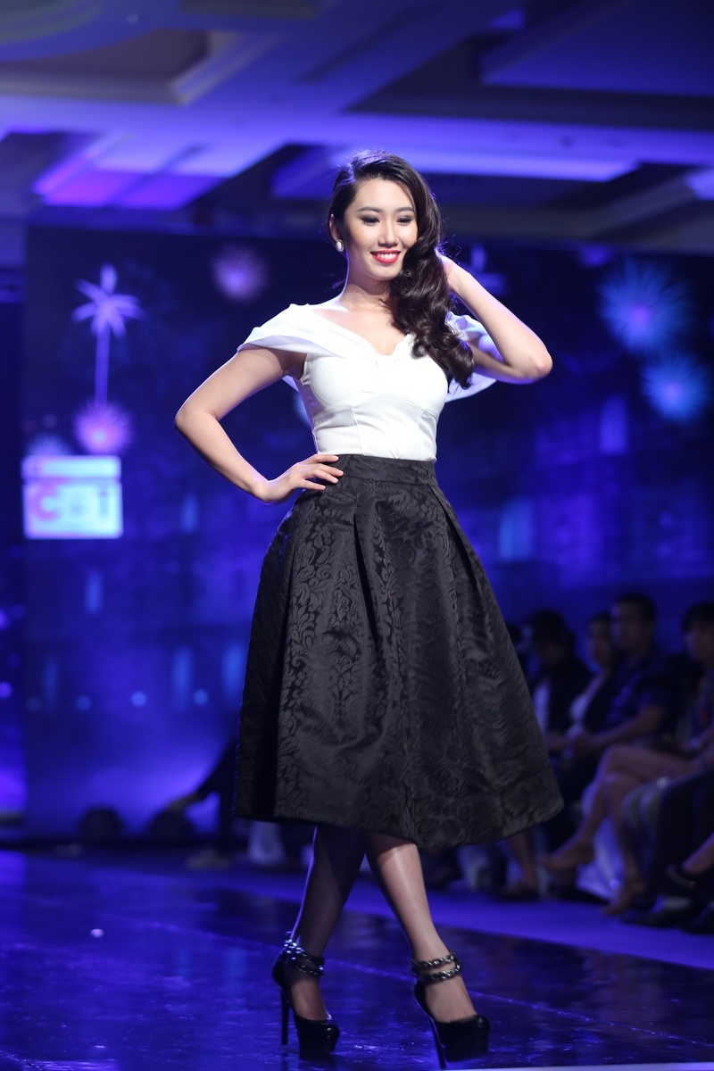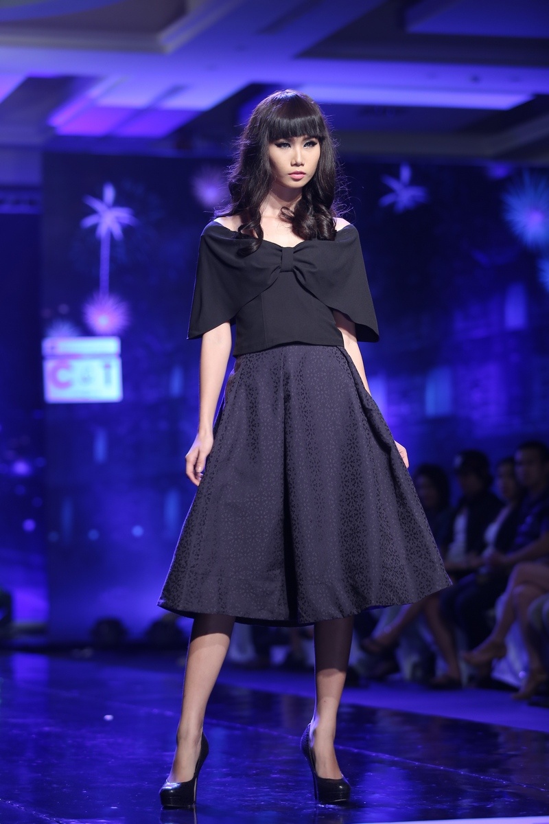 Người mẫu Thanh Thủy sâu lắng hơn với cách phối trang phục gam màu tối. Điểm nhấn nơ tại thân trước không làm mất đi vẻ trẻ trung khi dùng màu đen.
