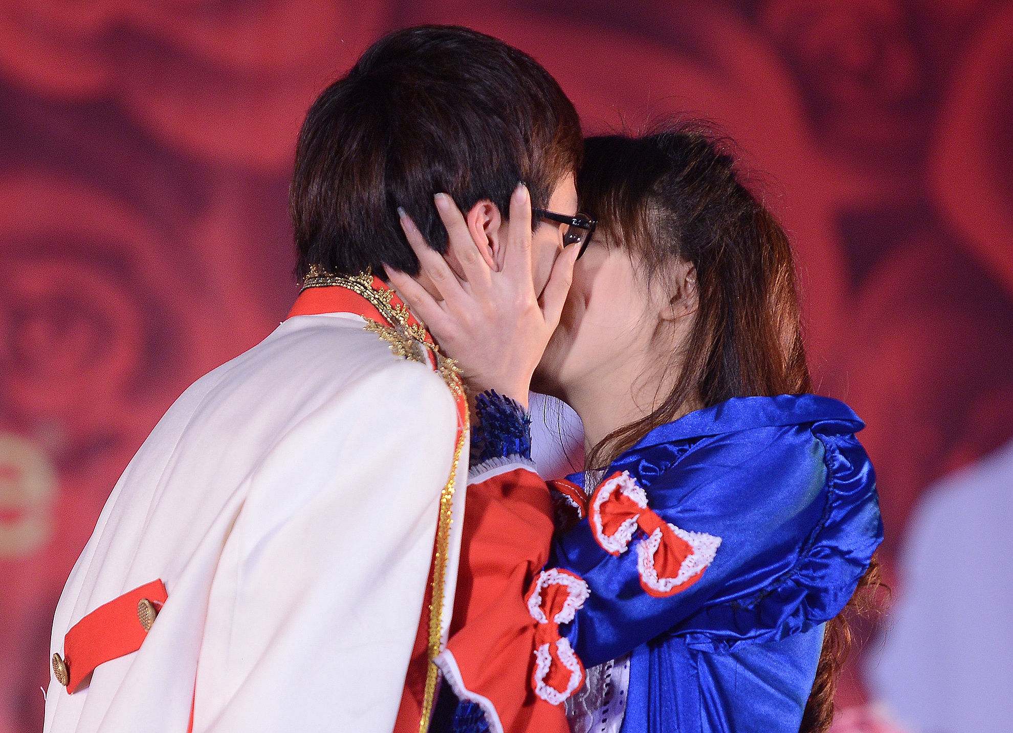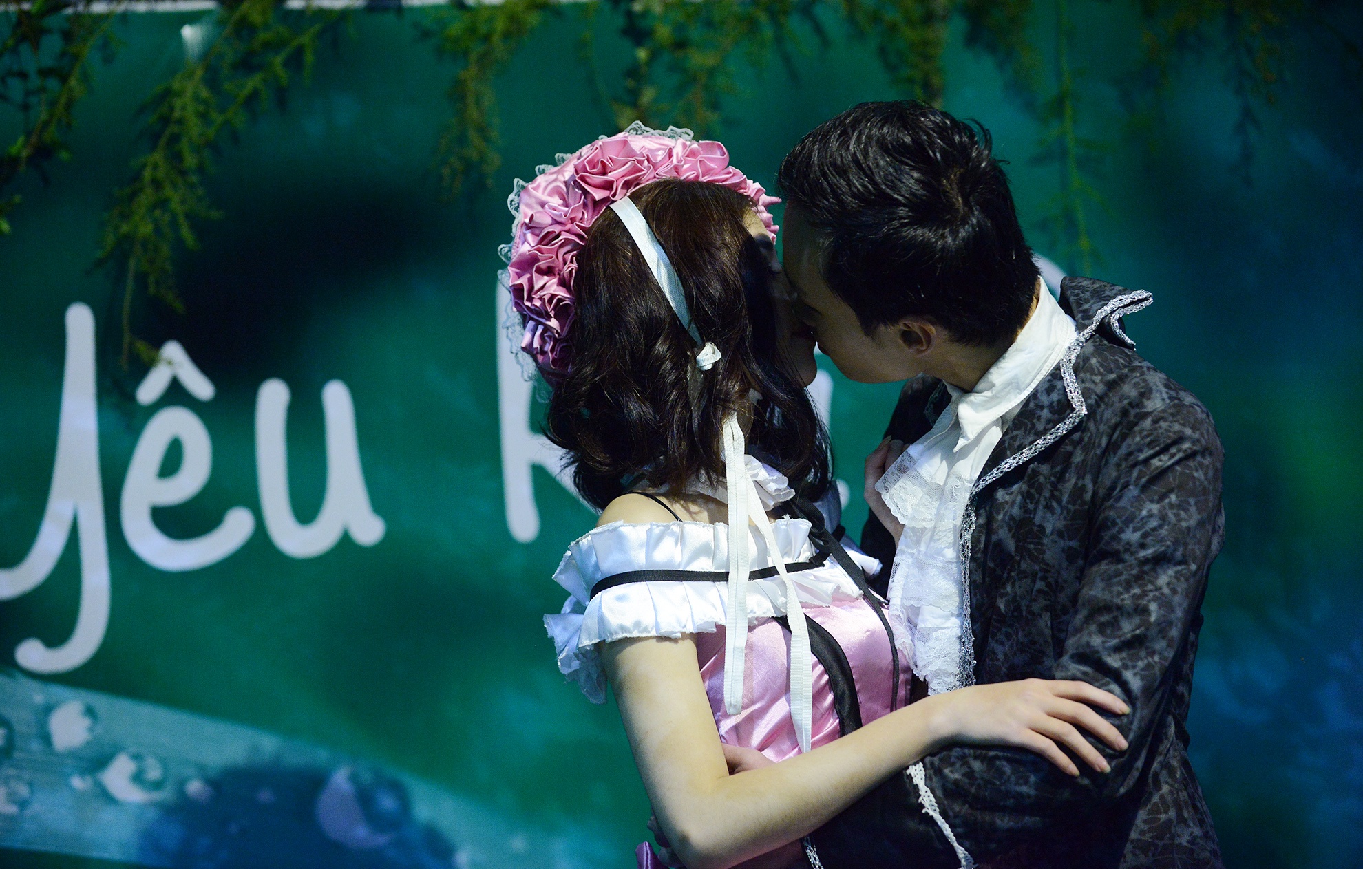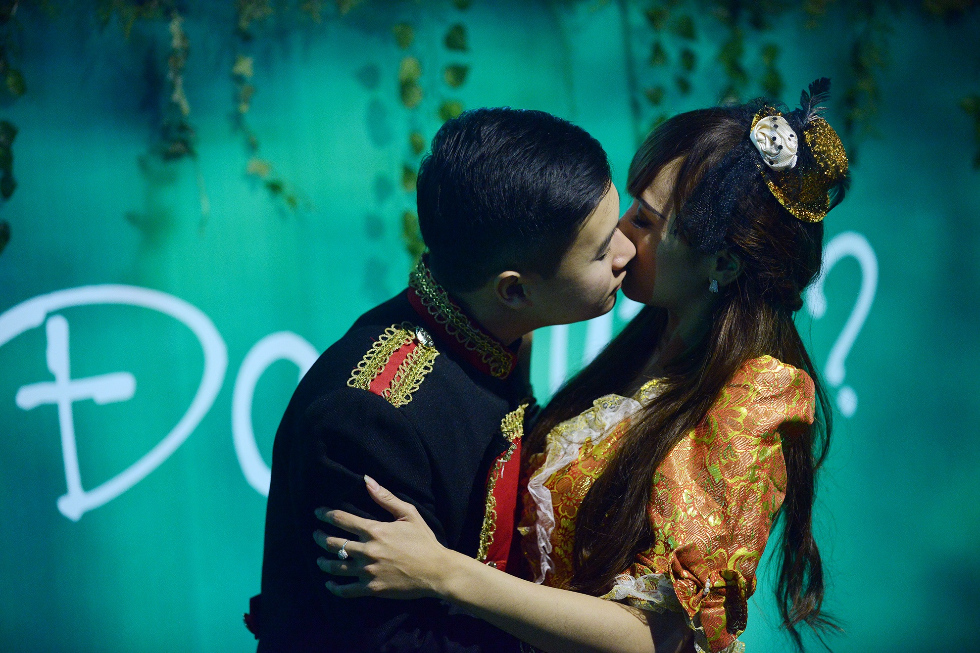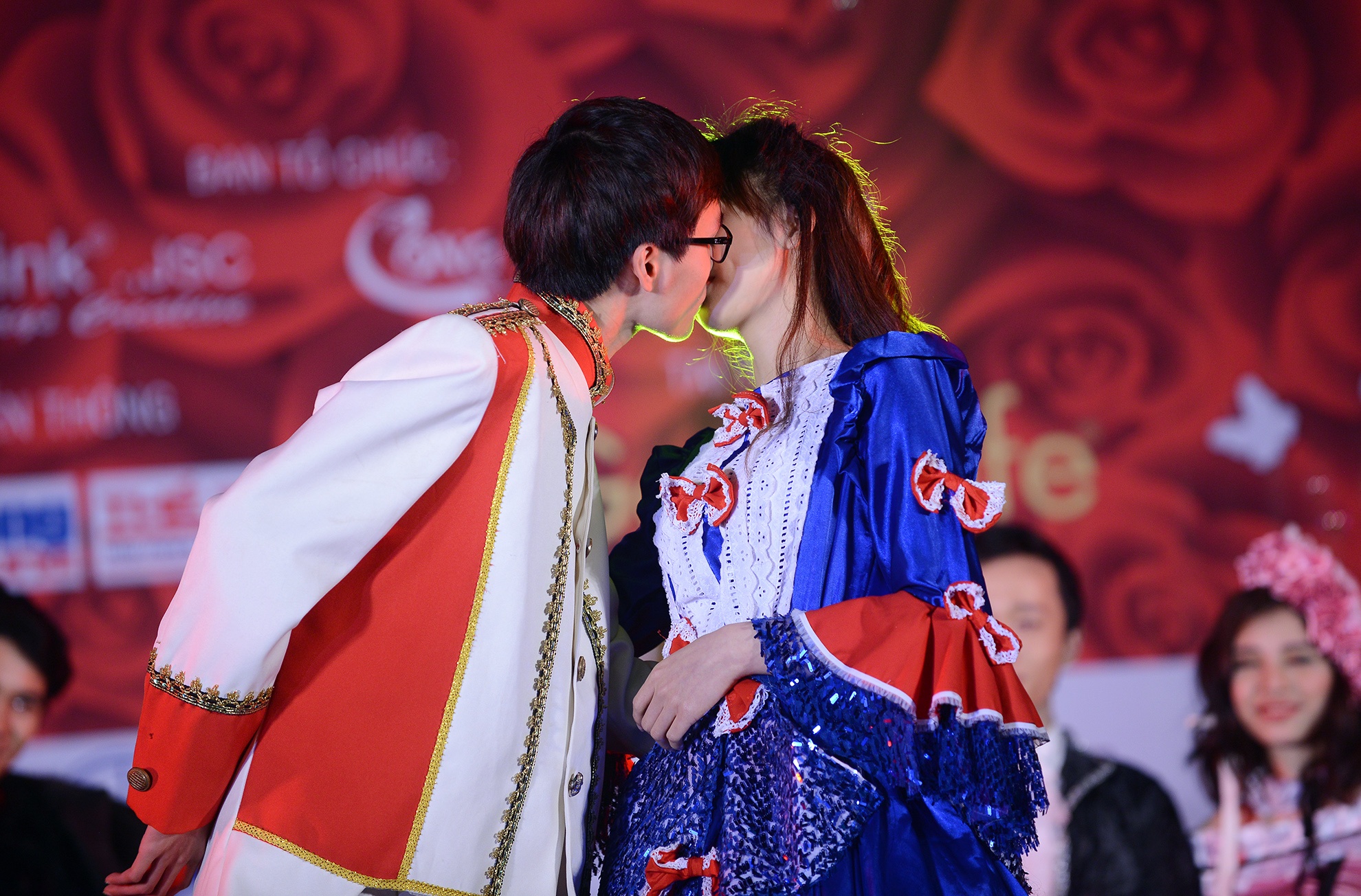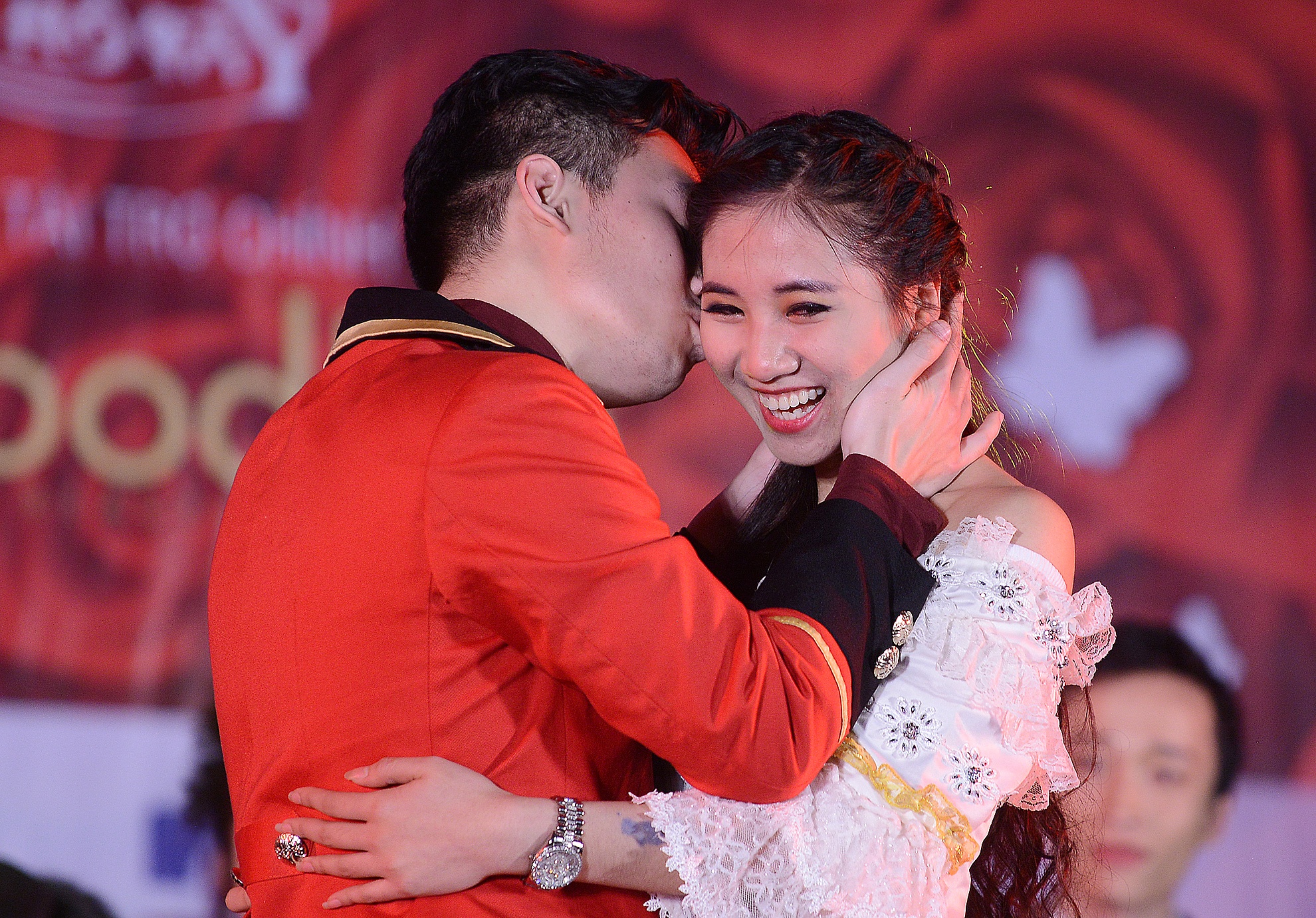 | Đôi bạn trẻ Thanh và Thảo không ngần ngại môi chạm môi trên sân khấu khiến nhiều người bất ngờ và vỗ tay khích lệ tinh thần. Họ yêu nhau từ lâu và đang có ý định kết hôn. |
