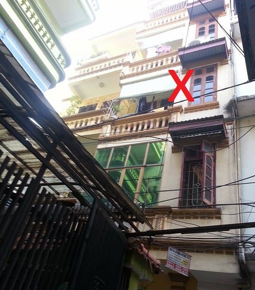 | Căn nhà 5 tầng (đánh dấu X) nơi Quát giết vợ rồi bỏ trốn. Ảnh: Nguyễn Hoàng. |