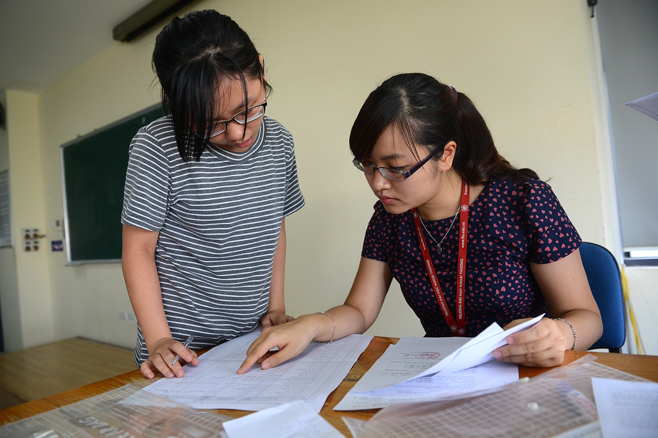 | Thí sinh làm thủ tục dự thi tại ĐH Ngoại thương sáng 3/7 (Ảnh: Tuấn Mark). |