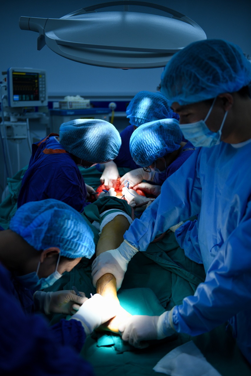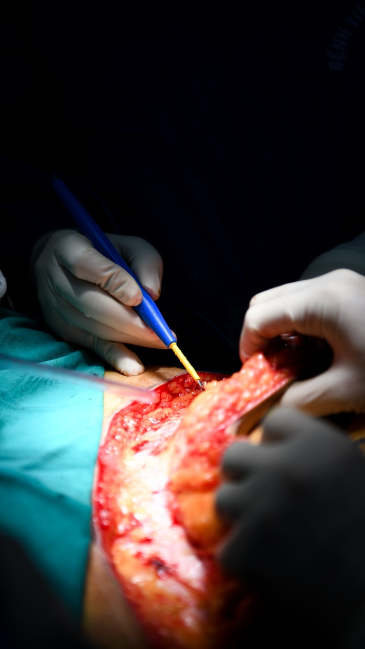 | Phẫu thuật vùng bụng cho H. kéo dài 2,5 giờ. Trong khi đó, một ê-kíp khác dùng phần da đã cắt bỏ ở vùng bụng để ghép vào chân của bệnh nhân. |